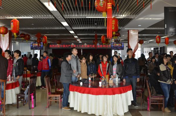 在一食堂三楼,来自伟德各个学院的学生党员、学生干部以及普通学生300多人收看了十八大开幕会,并认真聆听了胡锦涛总书记所作的报告。在收看过程中,同学们深深地被胡锦涛总书记的十八大报告所打动,并深受鼓舞。