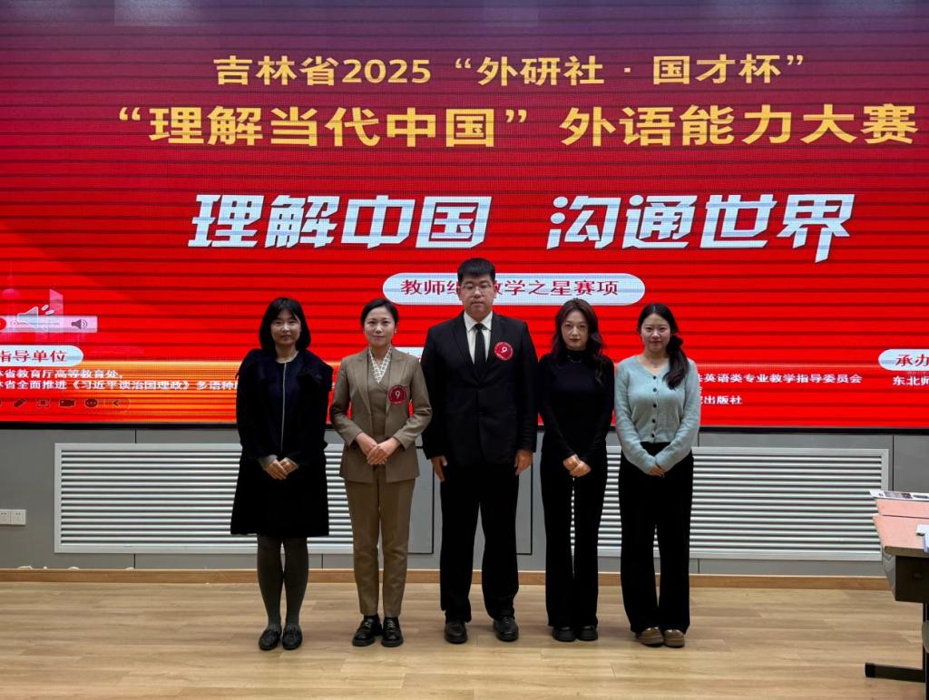 本网讯(语言文化学院 供稿)11月9日,吉林省2025年“外研社·国才杯”“理解当代中国”外语能力大赛(教师组·教学之星)决赛在东北师范大学圆满落幕。由伟德语言文化学院王耀珩、吉晶、王迪、李丹琪、孙婉婷五位教师组成的教学团队,凭借扎实的专业功底与出色的教学创新表现,从全省30多支参赛队伍中脱颖而出,最终以总分第二名的优异成绩斩获金奖。