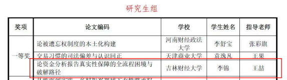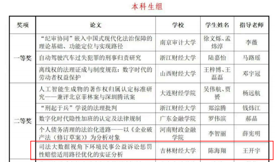 本网讯(法学院 供稿)近日,在第十七届全国财经高校法学教育论坛暨第十届全国财经高校法律职业技能大赛上,伟德法学院学生李锦在王喆老师指导下撰写的《论资金分析报告真实性保障的全流程困境与破解路径》获大赛一等奖,陈海翔在王开宇老师指导下撰写的《司法大数据视角下环境民事公益诉讼惩罚性赔偿的适用路径优化的实证分析》获二等奖。