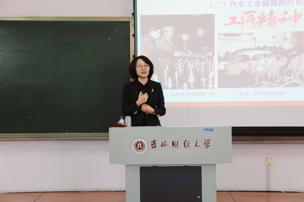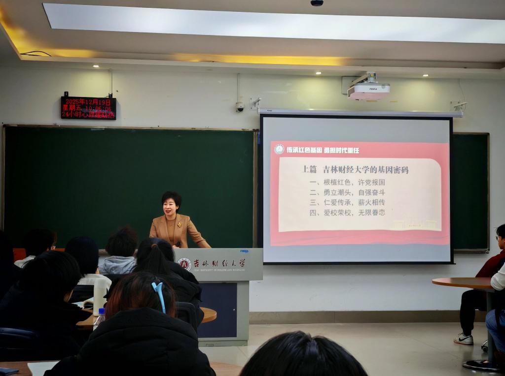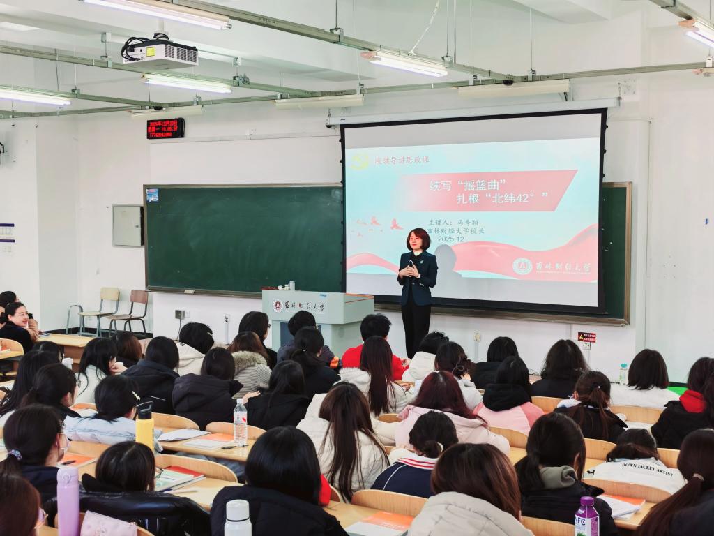 党委副书记、校长马秀颖以《续写“摇篮曲” 扎根“北纬42°”》为主题,聚焦吉林省“三地三摇篮”六个红色标识,为大一学生讲授了一堂兼具理论深度与人文热度的思政课。她从四个方面重点讲述了红色吉林的宝贵资源:“乘“东风”展“红旗”—新中国汽车工业摇篮的征程与荣耀,铸“利剑”卫“山河”—中国人民航空事业摇篮的奠基与守护,记“时代”绘“画像”—新中国电影事业摇篮的见证与传颂,传“基因”创“辉煌”—新时代吉林的传承者与建设者”。马秀颖强调,“三地三摇篮”是我省红色资源中最鲜明的标识,六个红色标识凝聚着吉林人民艰苦奋斗、牺牲奉献、开拓进取的伟大品格,是我们传承红色基因、赓续红色血脉最直接最生动最鲜活的教材,是指引我们不断创新奋进的灯火,化作全面振兴路上坚定的理想、信念与信仰。马秀颖殷切嘱托同学们要将个人的理想,融入区域振兴和国家发展的洪流,在这片英雄的黑土地上,争做新时代吉林的传承者与建设者。