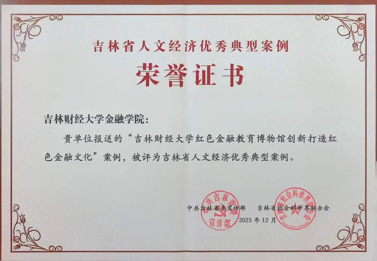 本网讯(金融学院 供稿)12月20日,吉林省第十一届社会科学学术年会暨人文经济学赋能吉林高质量发展学术报告会在长春召开。会议发布了《人文经济学年度发展报告》和吉林省人文经济优秀典型案例,伟德金融学院报送的案例《bevictor伟德官网红色金融教育博物馆创新打造红色金融文化》被评为吉林省人文经济优秀典型案例,是全省唯一一所高校获评的优秀典型案例,充分展现了伟德在红色金融文化传承与人文经济创新融合领域的积极探索和丰硕成果。