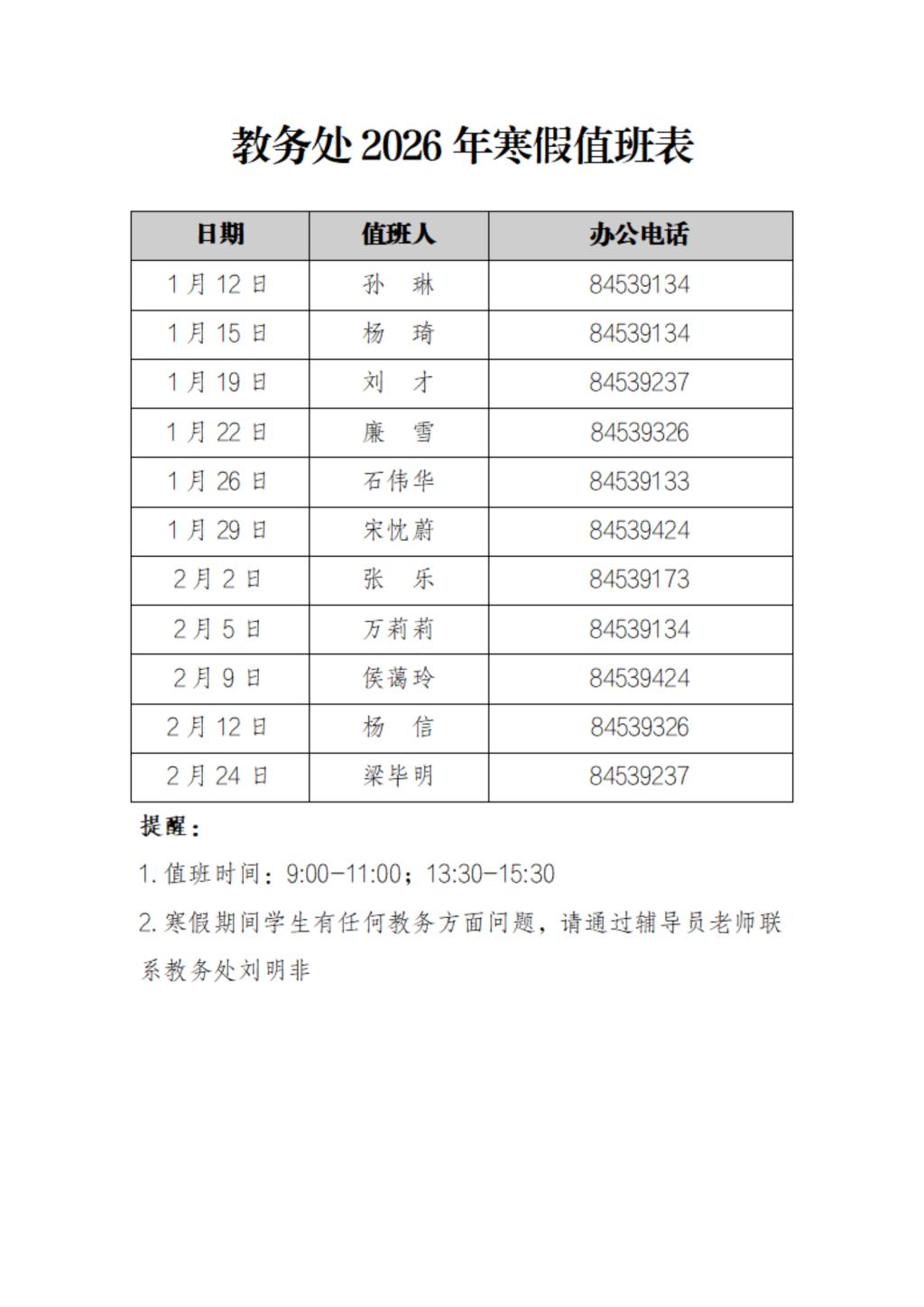 教务处2026年寒假值班表