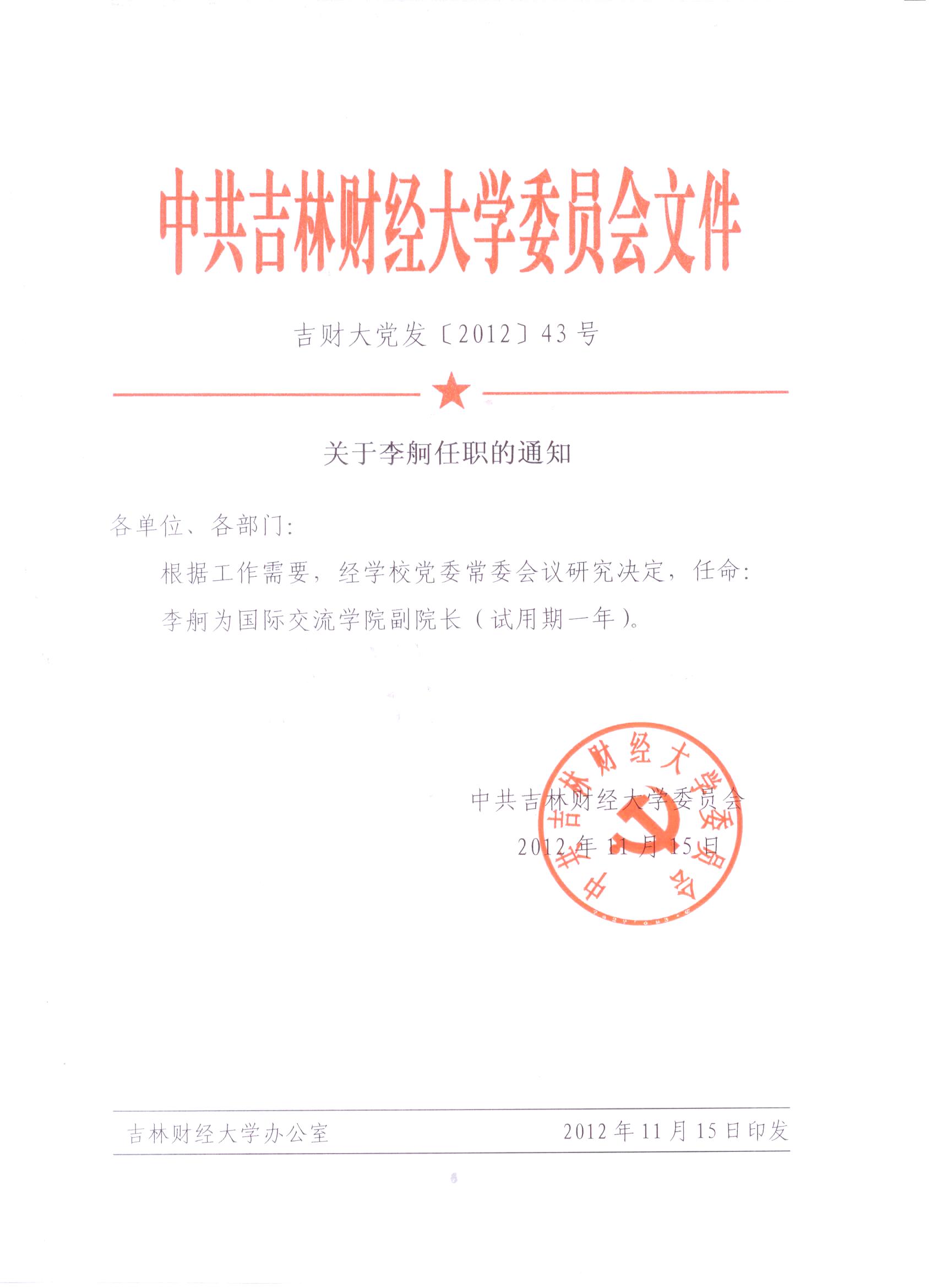 关于李舸任职的通知