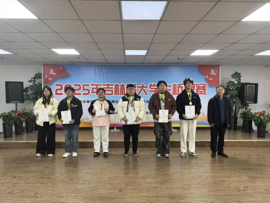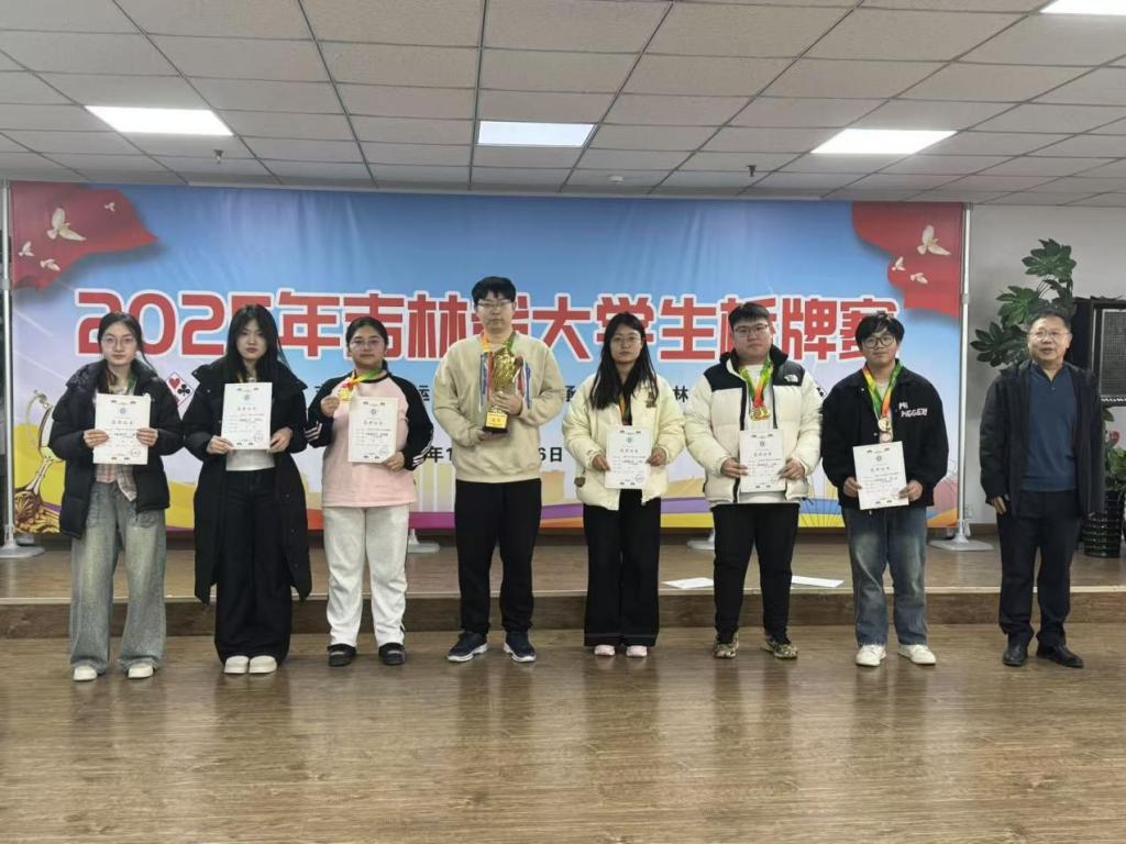 本网讯(体育教研部 供稿)11月15-16日,在吉林省大学生桥牌赛中,由统计与数据科学学院王研硕、程雯慧、黄文阳、王薇晶,税务学院云翔,国际经济与贸易学院张欣蕊组成的团队取得团体项目冠军;云翔和程雯慧获得双人赛项目冠军,王研硕和黄文阳获得双人赛项目季军,王薇晶与张子璇获得双人赛项目第五名的优异成绩。