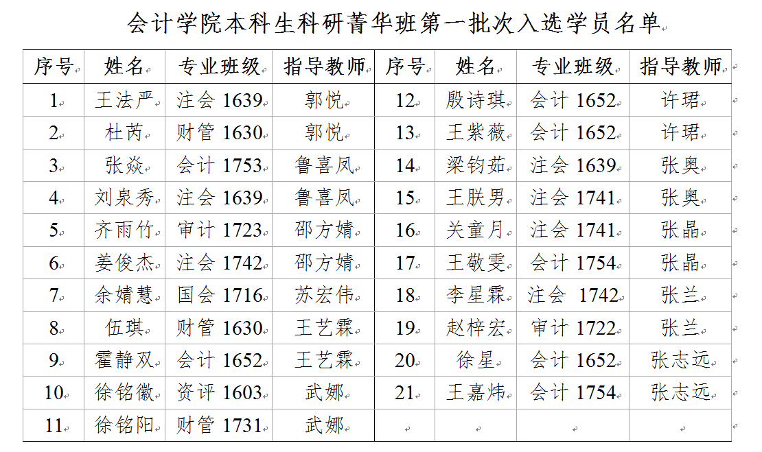 11月21日,在会计学院会议室举行了本科生科研菁华班第一批次学员选拔。会计学院本科生科研菁华班是学院为深化人才培养模式改革,提高本科生科研能力而设立的,本科生科研菁华班的科研导师目前共有11位具有博士学位的指导教师。