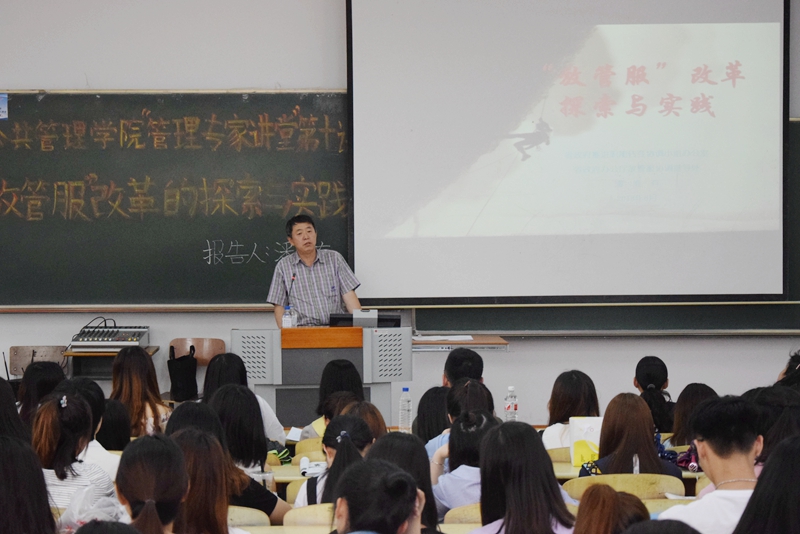 本网讯(公共管理学院  供稿)为使公管学院师生深入了解我国自2015年开始的“放管服”改革工作,增强学生对国家和社会的深入了解,使学生更好地认识改革实践,公共管理学院特别邀请到吉林省政府推进职能转变协调小组办公室、省政府办公厅放管服协调指导处潘维有处长,于6月14日在第一教学楼1115教室开展了以“放管服”改革的探索与实践为主题的管理专家讲堂第十讲,参加讲座的有公共管理学院院长蔡向东、公共管理学院党总支副书记梁烨及部分教职工和学院全体大一大二学生及部分研究生。