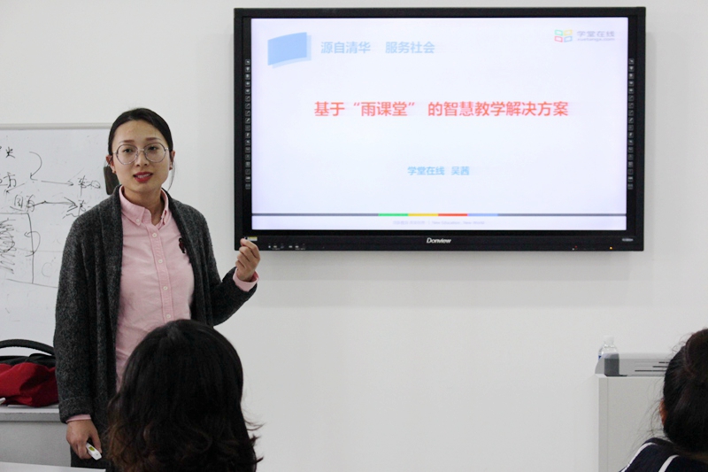 培训邀请到了清华大学学堂在线雨课堂教育与培训东北中心负责人吴茜作为主讲人。培训中吴老师首先向老师们介绍了智慧教学的理念,然后将“雨课堂”的功能逐个进行了说明和演示,还演示了雨课件的制作,并与教师进行了现场手机互动。