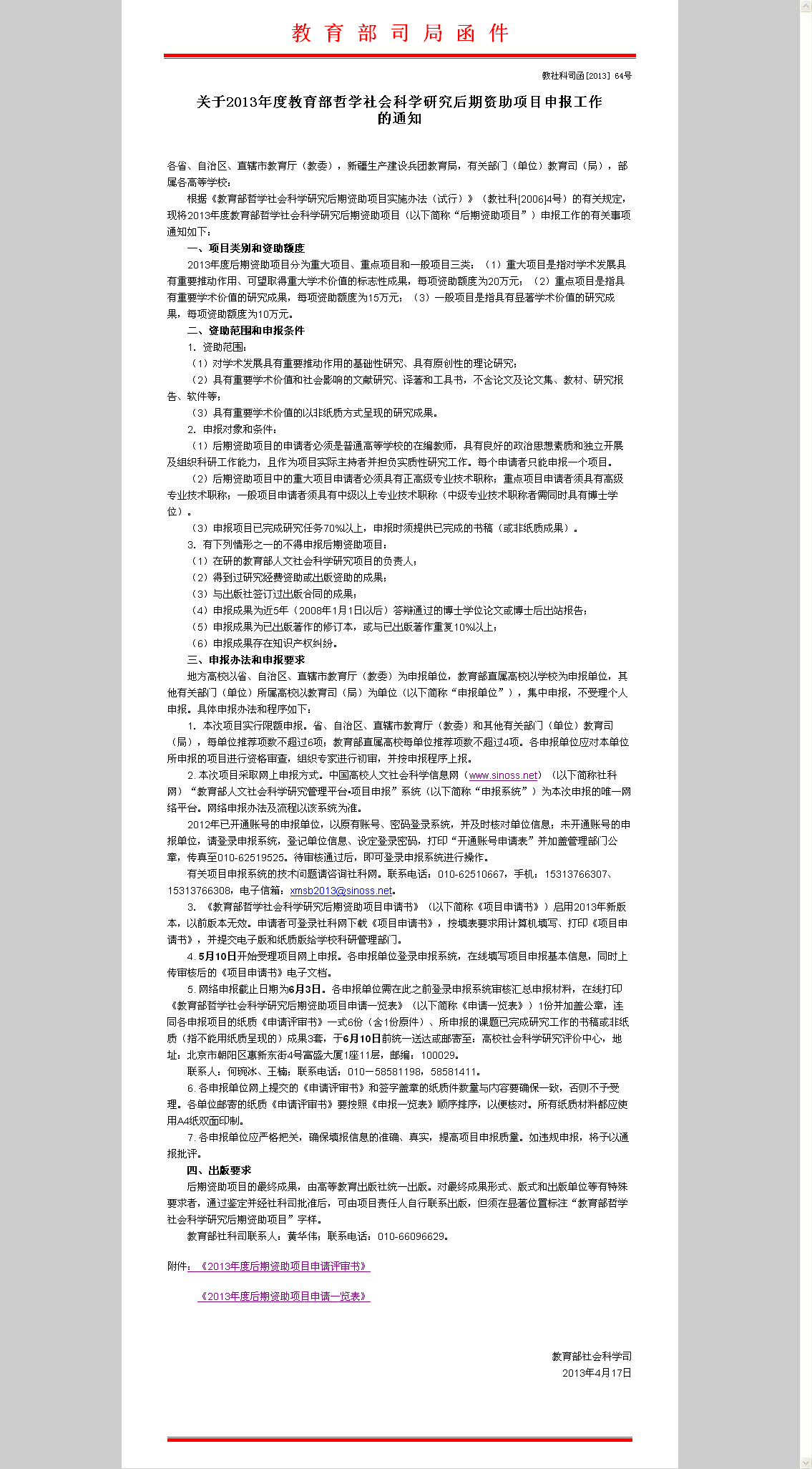 根据《教育部哲学社会科学研究后期资助项目实施办法(试行)》(教社科[2006] 4号)的有关规定,现将《关于2013年度教育部哲学社会科学研究后期资助项目申报工作的通知》(教社科司函[2013]64号)转发给你们,同时组织伟德开展2013年度教育部哲学社会科学研究后期资助项目申报工作,具体要求如下: