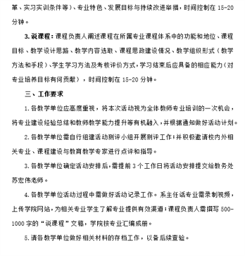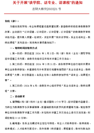 2023年12月-2024 年4月,全校范围开展院长谈学院、系主任话专业、教师说课程系列活动。2024年5月中旬,教务处将组织在全校范围内组织召开“系主任话专业、教师说课程”大赛,树榜样、立典型。