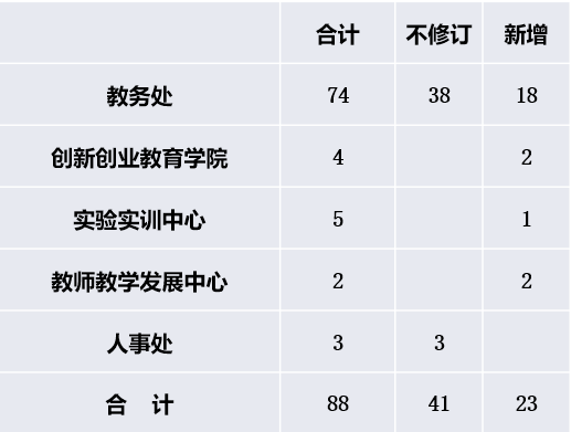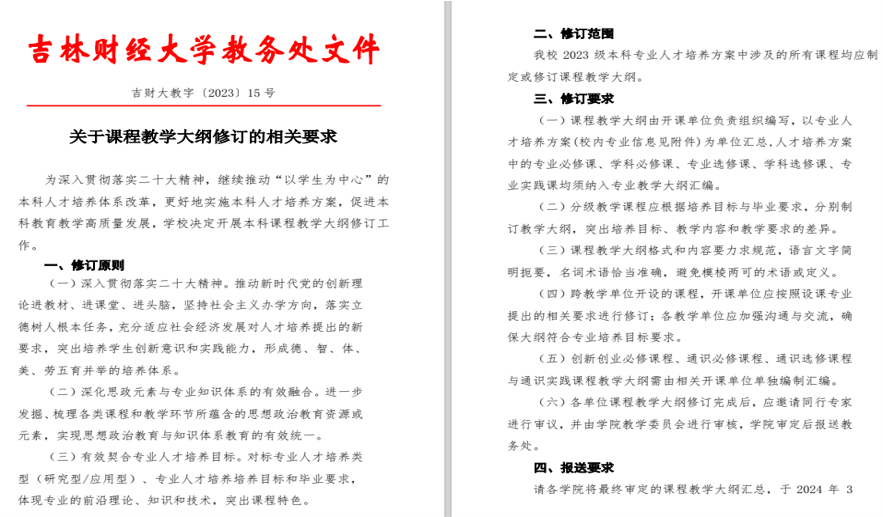 2024年1月,教务处组织开展人才培养方案和教学大纲的修订工作,修订重点是落实以学为中心和产出导向理念,对标专业人才培养类型(研究型/应用型)、专业人才培养培养目标和毕业要求,力争在大纲中体现专业的前沿理论、知识和技术,突出课程特色。两项工作预计完成时间在2024年5月中旬。