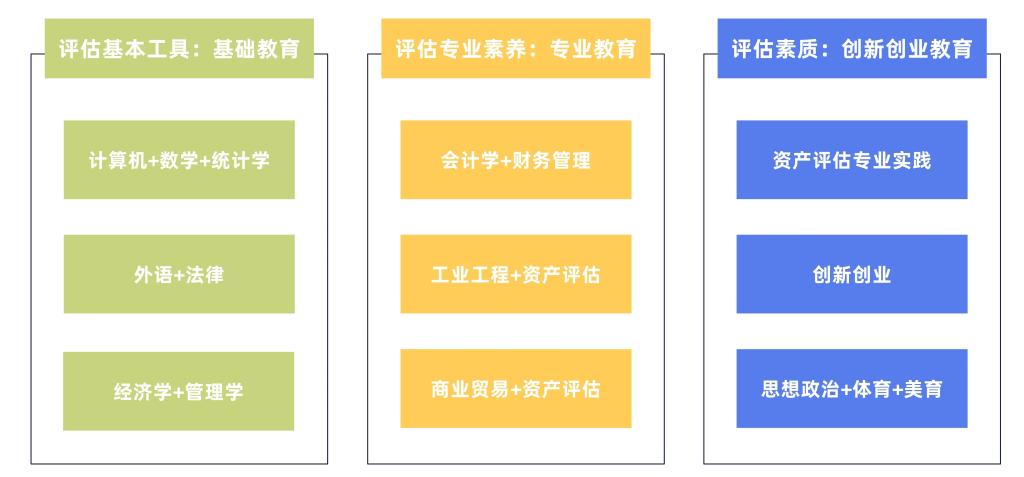 资产评估专业采用基础教育、专业教育和创新创业教育相结合的人才培养模式,坚持多途径培养人才,适应学生个性发展的需求,使学生成为“厚基础、宽口径、强能力、高素质”的资产评估专业人才。基础教育包括通识课程和学科课程。通过通识课程,夯实学生的外语、数学和计算机基础,掌握从事资产评估工作的基本工具;通过学科课程,打通经济学、管理学、法学等学科的知识领域,开阔学生视野,增强学生的专业适应能力。专业教育包括专业课程和实践课程。通过专业课程,向学生传授从业所需的专业知识、基本技能和学科前沿;通过实践课程,强化对学生的专业技能训练,提高学生的专业素养。通过创新创业教育,帮助学生树立创新意识和创业精神、培养创新思维和创业能力,提高学生的综合素质。