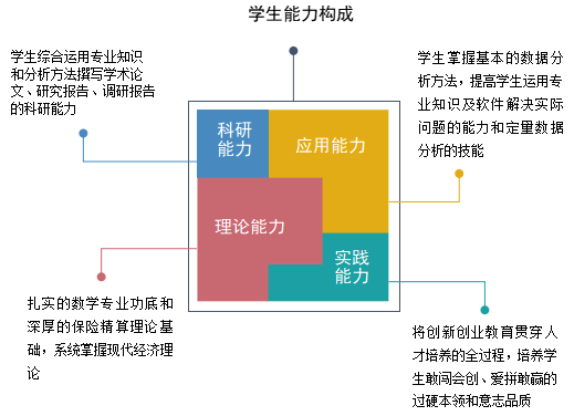 本专业培养德、智、体、美、劳全面发展,适应社会经济发展需要,并受到严格的数理思维、科学实验等训练,具有良好的科学和文化素养、扎实的数学专业功底和深厚的保险精算理论基础,系统掌握现代经济理论,具备处理、分析数据的能力,能在保险公司、银行证券、投资公司等企事业单位从事社会保障、风险管理、精算分析、金融监管、统计信息管理、数据分析、大数据处理等工作以及在大专院校、研究机构从事教学科研、应用开发等工作的复合型人才。