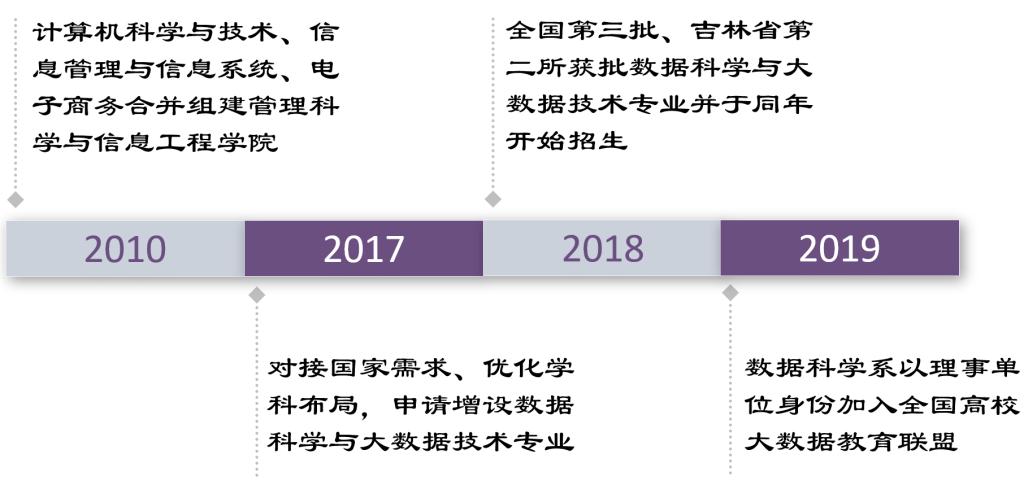本专业所在的管理科学与信息工程学院2010年由计算机科学与技术、信息管理与信息系统、电子商务三个专业合并组建;2017年对接国家、地方需求,优化学科办学布局,结合学院学科、专业与师资优势,申请增设数据科学与大数据技术专业;2018年伟德于全国第三批、吉林省第二所获批数据科学与大数据技术专业并于同年开始招生;2019年数据科学系以理事单位身份加入全国高校大数据教育联盟。