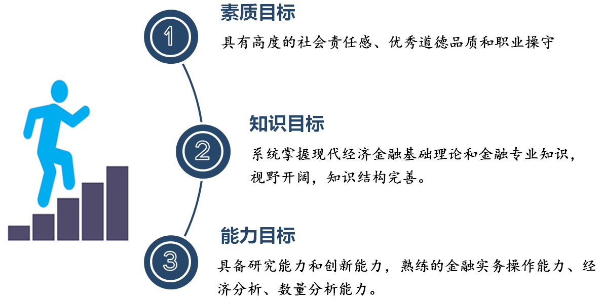 本专业以培养德智体美全面发展的社会主义建设者和接班人为根本任务,旨在培养具备高度社会责任感和职业道德,宽厚扎实的金融理论基础,精湛的金融实践技能,能够适应金融业发展新趋势,胜任银行、证券、保险、信托等金融机构、金融监管部门及科研单位的专业工作,具有国际化视野和创新创业能力的高素质、复合型、创新型金融人才。