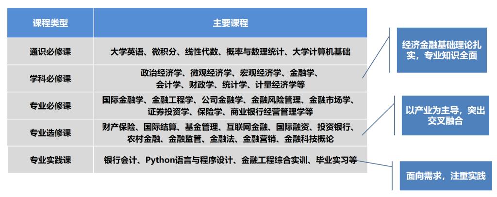 专业突出金融通才教育专业特色,遵循“厚基础、宽口径、多方向、重实践”的基本原则,在夯实经济学、金融学基础理论之上,加大金融业务前沿理论与实践教学力度,将创新创业教育纳入到教学当中,打造一套质量上乘、特色鲜明、紧扣前沿、强化实践的课程体系。课程设置包括通识必修、学科必修、专业必修选修、专业实践等模块。