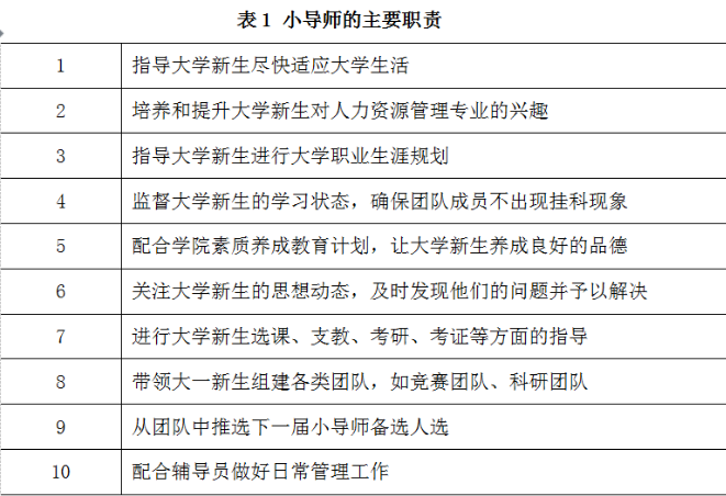 除了专业指导教师外,每年从大三的同学中选拔德才兼备或具有特色优势的同学给大一新生做小导师。小导师制是对人力资源管理专业文化的有效传承,是对人力资源管理专业新生的指导和帮助,是对“00后”大学生的合理监督。小导师的主要职责见表1所示。