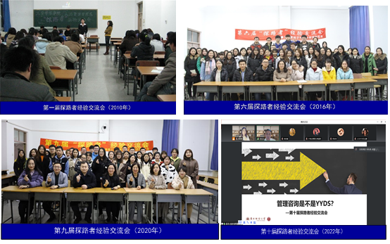 自2010年开始,人力资源管理专业连续开展“探路者”经验交流会活动。在每年的毕业季,选拔优秀的、各具特色的毕业生与学弟学妹们交流就业指导和职业规划经验,以提升大二大三同学的职业生涯规划能力和就业能力。“探路者”经验交流会已经连续举办12届,活动现场见图5所示。