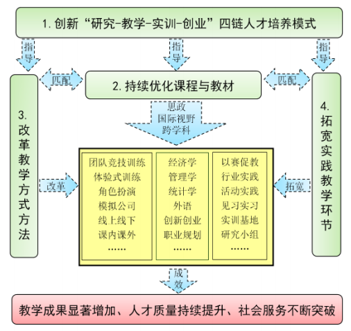 人力资源管理专业自2021年获批国家一流专业建设点以来,根据国家社会经济发展需求和新文科、新商科人才要求,牢牢把握科教融合、产教融合方向,强调企业数智化场景,创新人才培养模式、强调学科交叉、优化课程与教材、改革教学方式方法、拓宽实践教学环节、突出赛训交融,积极探索和践行企业数智化场景下的高素质、复合型人力资源管理人才培养模式(见图3)。