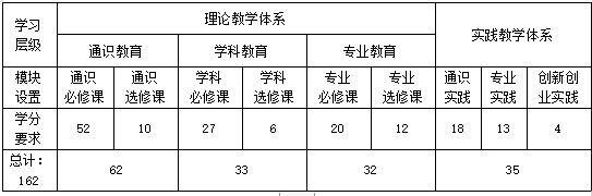 学生毕业最低学分要求:理论教学127学分,实践教学35学分,合计162学分。其中,各模块的具体学分要求见下表: