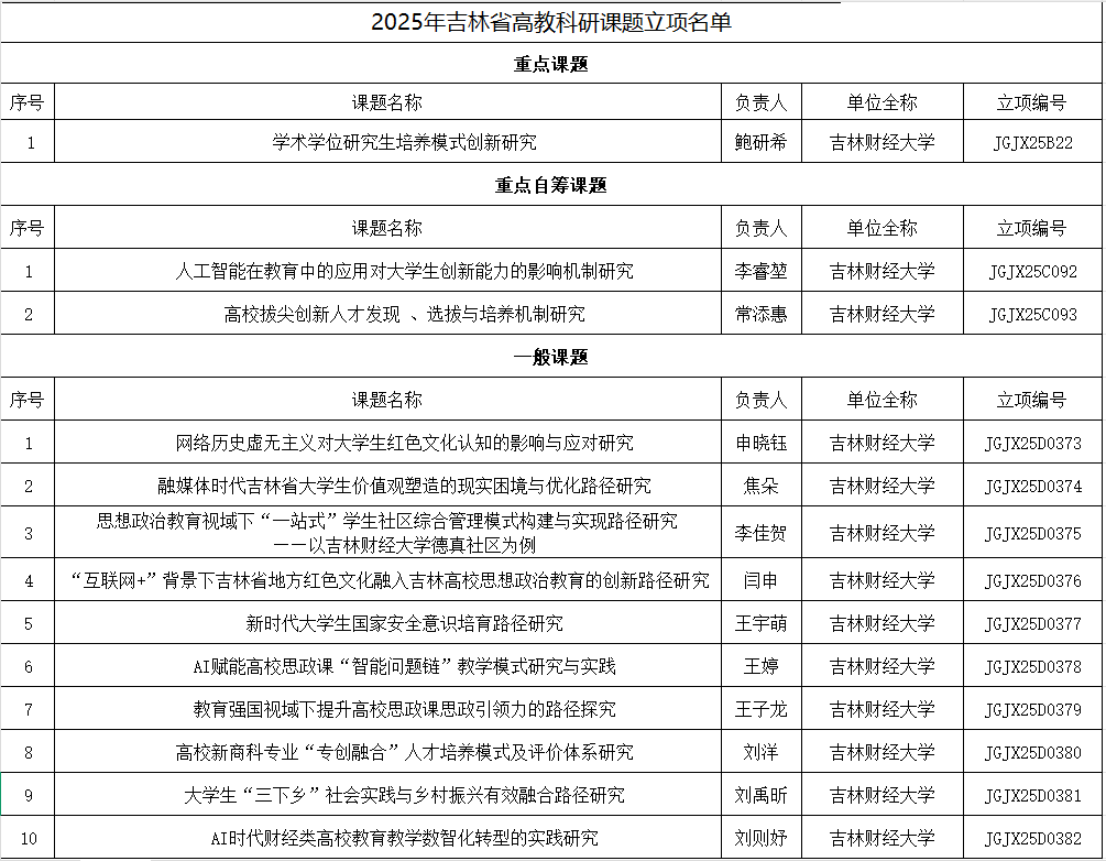 6月30日,吉林省高等教育学会发布了《2025年度吉林省高教科研课题立项通知》,经省高教学会专家组三轮评审,伟德有13项课题获批2025年度吉林省高教科研课题立项,其中《学术学位研究生培养模式创新研究》获批立项重点课题,获得省高教学会3000元经费资助;《人工智能在教育中的应用对大学生创新能力的影响机制研究》《高校拔尖创新人才发现 、选拔与培养机制研究》2项课题获批立项重点自筹课题;《网络历史虚无主义对大学生红色文化认知的影响与应对研究》等10项课题获批立项一般课题。